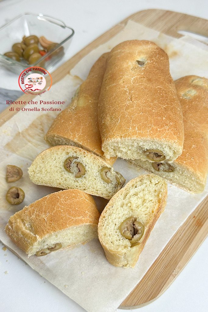 Pão com azeitonas, deliciosos filões macios recheados com azeitonas. Eu usei azeitonas esmagadas em salmoura feitas em casa, mas você pode usar as que encontrar no supermercado. Podem ser azeitonas verdes sem caroço, mas também azeitonas leccino ou azeitonas taggiasche, em conserva ou em salmoura, não faz diferença, o importante é que estejam bem escorridas e secas. Para a massa do pão, usei semolina refinada e farinha 00 para uma fermentação de poucas horas, mas se tiver tempo para uma longa fermentação, pode substituir também por farinha 0 ou 1, misturada em parte também com farinha integral para atender a todas as necessidades. Lembro que, quando usamos farinha integral, é recomendável uma fermentação de pelo menos 24 horas, e se a porcentagem de farinha integral for alta, até mais de 48 horas, você verá os resultados, seja para filões, pizza ou pães. Eu fiz pequenos filões com meu pão, mas você pode dar a forma que quiser, assim é prático de manusear e assar rapidamente, e são fatias pequenas perfeitas para aperitivos, ou menus de festas, para nossos buffets, ótimo sozinho, porque seu sabor é excepcional, mas também pode ser espalhado com cremes, molhos, ou recheado com queijos e frios. Se quiser, pode enriquecer o recheio, com salame, queijo, sementes de erva-doce, ou em vez de azeitonas, pode usar nozes, como fiz eu para metade dos filões.