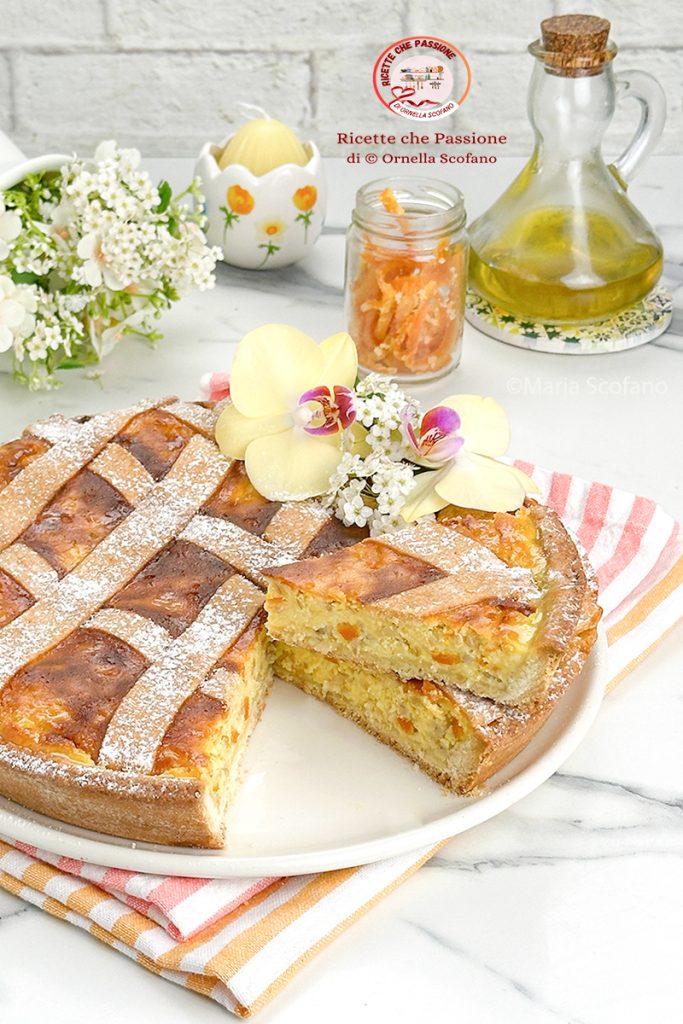Pastiera com massa quebrada de azeite de oliva perfumada com laranja. Uma pastiera fácil e rápida com a massa quebrada de azeite de oliva pronta para uso, pois não precisa descansar. A pastiera como é tradição não pode faltar na Páscoa, fiz uma hoje, realmente deliciosa, na verdade faço todos os anos e cada vez mudo algo para torná-la sempre especial, no ano passado fiz a versão da pastiera original napolitana com massa com banha, e devo confessar que gostamos muito. Este ano, quis tentar sem manteiga e sem banha, e preparei uma deliciosa pastiera com massa quebrada de azeite de oliva, e desta vez na frolla não coloquei fermento, e ficou realmente ótima, depois de um pouco de descanso, como deve ser para a pastiera, a consistência é perfeita, assim como o sabor, e não, não se sente o azeite de oliva. Eu também adorei esta versão, com o descanso a frolla tem a consistência certa e o sabor aparece pouco a pouco, onde o gosto das laranjas cristalizadas no recheio se torna bem perceptível. Normalmente na pastiera também vai a cidra cristalizada, mas eu coloquei apenas casquinhas de laranja cristalizadas, aquelas que eu mesma fiz há alguns meses e conservei, justamente para preparar meus doces caseiros. Então, aromatizei também a frolla e o recheio apenas com casca de laranja ralada e no final posso dizer que a pastiera deste ano com azeite de oliva e laranja está realmente deliciosa, comida esta manhã no café da manhã que é um prazer. Então, vamos ver como fazê-la.