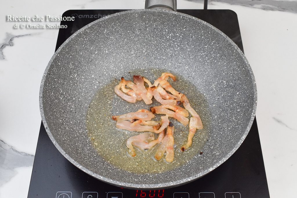 Cortamos o bacon, retirando a pele, em tiras, e douramos na frigideira, sem adicionar nada, a parte gorda aos poucos ficará transparente e liberará um pouco de gordura, deixamos ficar um pouco crocante. Reservamos e na frigideira preparamos os aspargos.