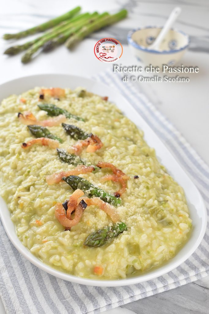 O risoto com aspargos e bacon crocante é um primeiro prato cremoso de sabor delicado e refinado, preparado com aspargos frescos da estação e quando a primavera explode em todas as suas nuances, a mesa também se veste de suas cores e aromas. Preparar o risoto cremoso de aspargos é muito simples, e para a receita também usamos as partes descartadas dos aspargos, com as quais preparamos primeiro um delicioso caldo de legumes para cozinhar o risoto, e depois de pronto o caldo, vamos batê-los junto com os outros aspargos para preparar um excelente creme para enriquecer e tornar ainda mais cremoso nosso risoto com aspargos. Que prazer trazer à mesa esse bom risoto manteigado com parmesão, sem lactose, e leve, com a adição de um pouco de bacon crocante para torná-lo mais saboroso, mas quem quiser uma versão vegetariana ou simplesmente mais leve pode evitar adicioná-lo, de qualquer forma será um prato delicioso perfeito para servir em um almoço em família.