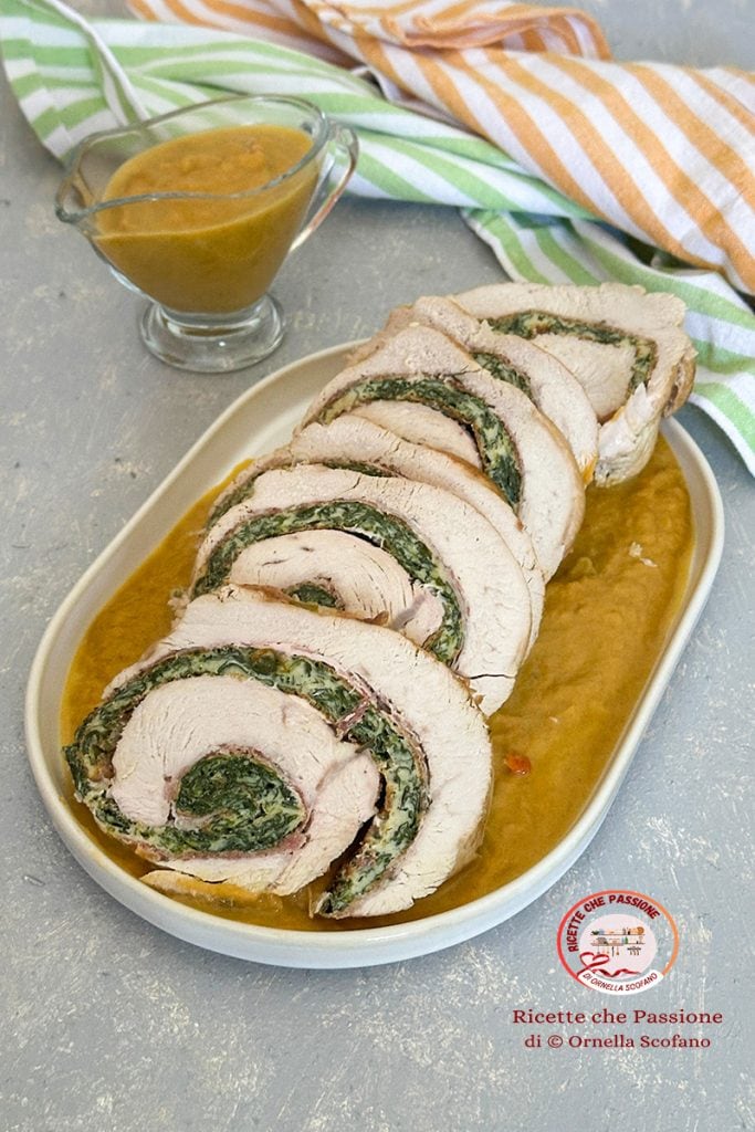 Rolo de peru recheado para você servir algo delicioso à mesa, fácil de preparar e realmente muito saboroso, cozido na panela, sem forno. Na Páscoa, eu não tinha ideia do que cozinhar, então me lembrei que tinha no congelador um belo pedaço de peito de peru, queria fazer um assado para o almoço de domingo, em casa todos adoram, então faço sempre, só que ultimamente está difícil de encontrar, então, mesmo que eu não precisasse imediatamente, quando estava no açougue e encontrei, pedi um belo pedaço e congelei. Assim, acabei tendo para a ocasião um belo pedaço de cerca de 1,2 kg, só precisei descongelá-lo lentamente na geladeira desde a noite anterior e por volta das 10 da manhã comecei a prepará-lo, é muito fácil e rápido de fazer. Vamos ver como fazer, será perfeito para as próximas ocasiões, é realmente delicioso e muito macio, você pode cortar com um garfo.