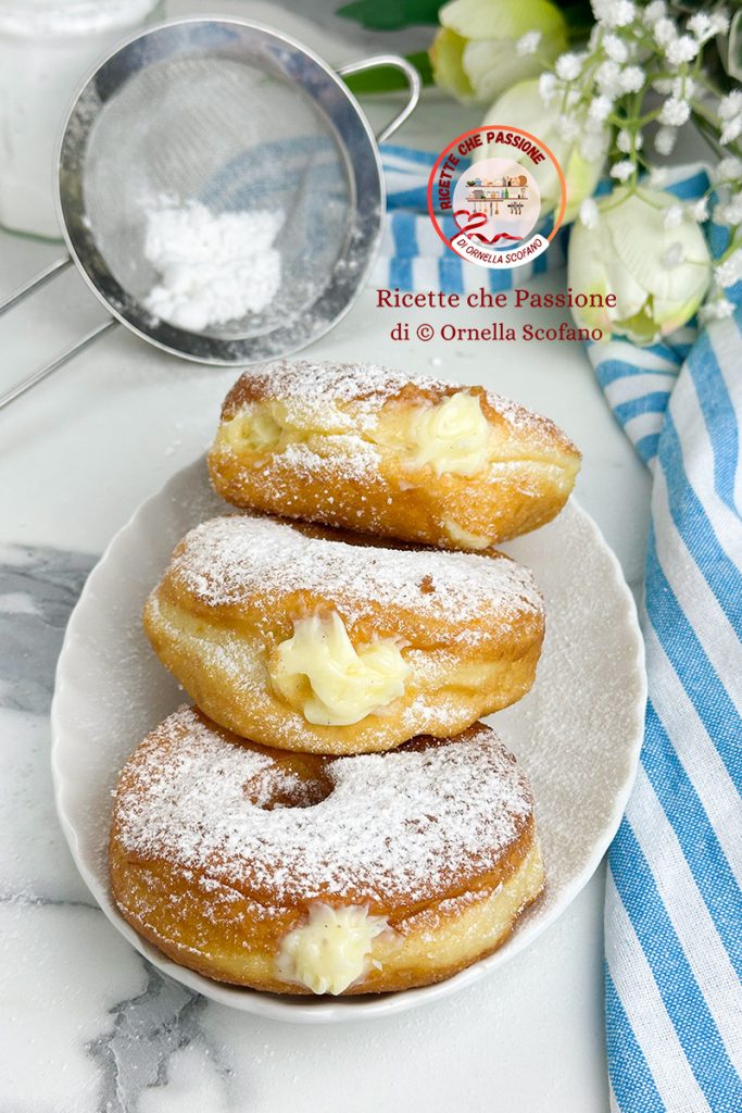 Deixamos esfriar um pouco e depois recheamos com o creme de confeiteiro, usando um saco de confeiteiro com bicos, podemos fazer furos com um bico bem pontiagudo, fazendo vários buracos, ou simplesmente cortamos ao meio e recheamos com o creme como geralmente acontece na confeitaria. Polvilhamos então com açúcar de confeiteiro. Se quiser tornar o creme mais saboroso, você pode adicionar 200 g de chantilly. Ou você pode também preparar um creme de confeiteiro com mascarpone, ou um creme rápido de mascarpone ou um creme de chocolate.