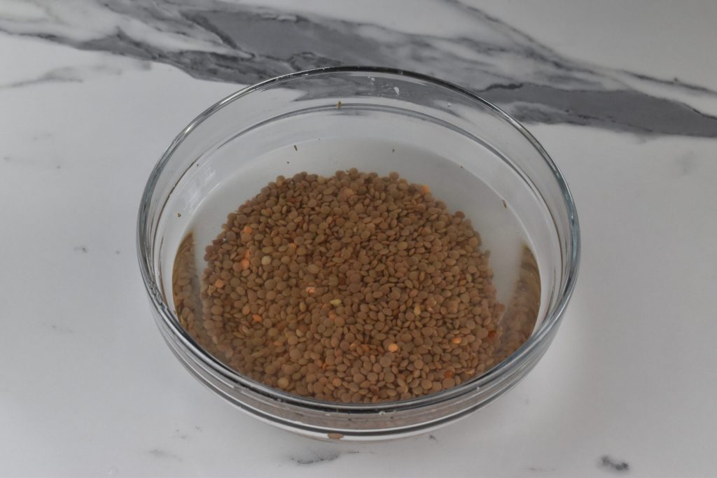 1. Em uma tigela colocamos as lentilhas, cobrimos com bastante água fria e lavamos, misturamos as lentilhas e descartamos a água suja.
