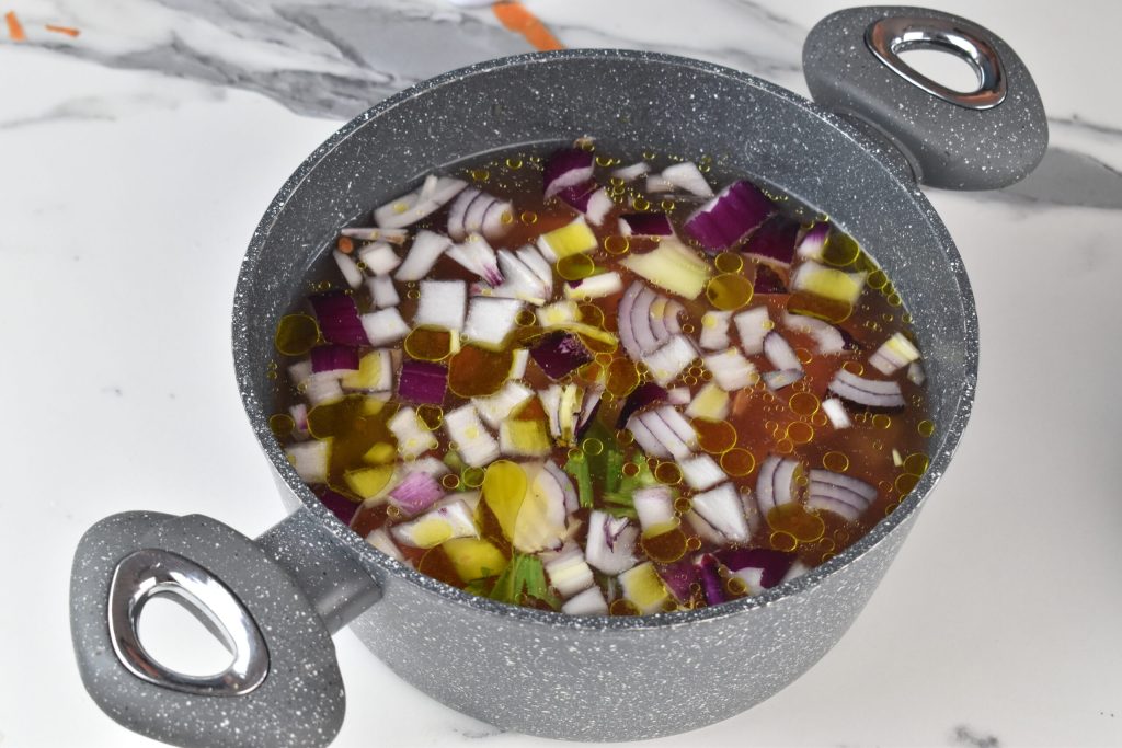 3. Adicionamos na panela todos os temperos, aipo, cenoura e cebola, você pode cortá-los em pedaços se gostar de encontrá-los na sopa, ou picá-los finamente, mesmo com um picador, eu deixei em pedaços grandes.