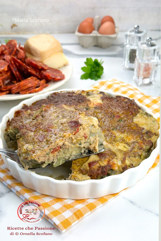 Uma deliciosa torta de alcachofras à calabresa, uma receita que eu roubei da minha mãe e preparo todo ano como tradição na Páscoa, assim como sempre faz minha mãe, só que eu me divirto a cada vez fazendo pequenas mudanças para que fique sempre diferente, mas ainda mais saborosa. Desta vez, adicionei ao recheio sopressata calabresa e caciocavallo defumado, outras vezes a tinha preparado apenas com mussarela e linguiça fresca. Então você também pode variar um pouco a gosto, mas a base é sempre a mesma, alcachofras para a base, que podemos escaldar ou cozinhar na panela em molho, e para o recheio, ovos, carne e queijos, tanto ralados, mussarela e provola defumada para enriquecer. Então vamos ver como prepará-lo. Você encontra esta receita na coleção receitas com alcachofras.