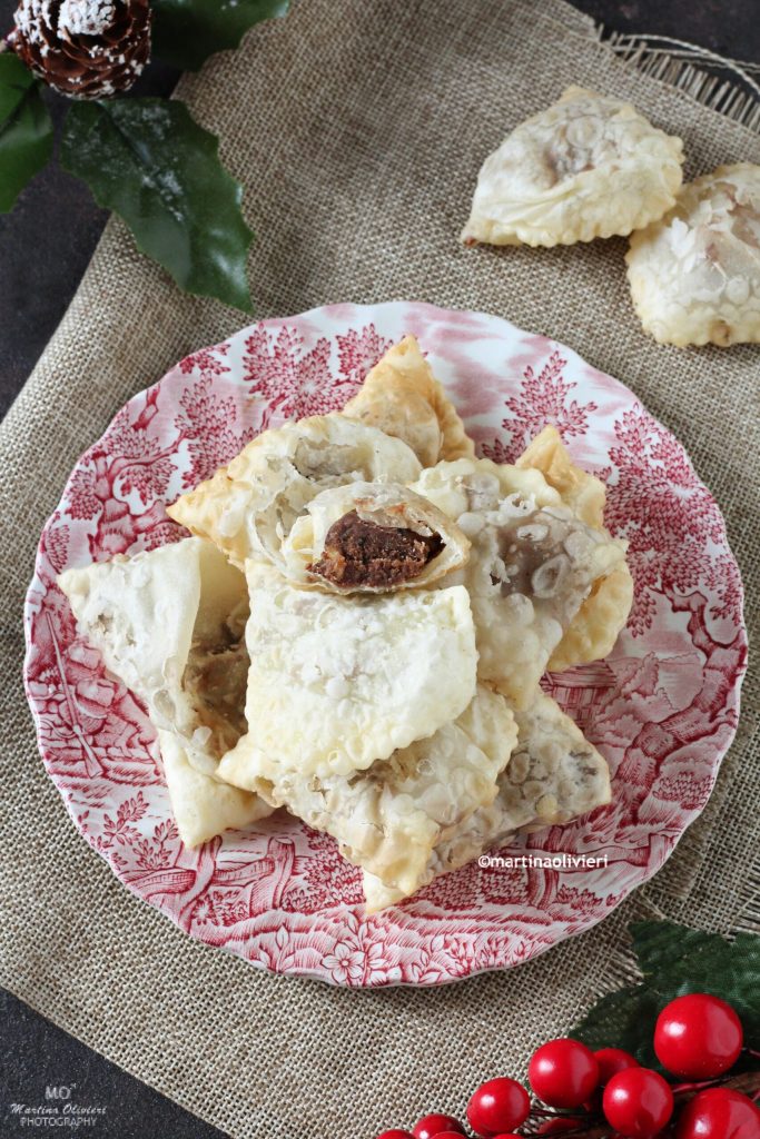 Os caggionetti (ou calcionetti) são o doce de Natal por excelência de Teramo. Originários da Província de Teramo e depois difundidos por toda a região, em cada cidade de Abruzzo no período natalino são preparados esses doces e cada zona prevê uma variação no recheio. Semelhantes aos ravioli fritos, os caggionetti na minha cidade se recheiam com grão-de-bico, ou com castanhas, chocolate amargo e amêndoas. A receita que proponho hoje prevê o uso de grão-de-bico, como minha avó preparava. No final do almoço de Natal, não podem faltar!