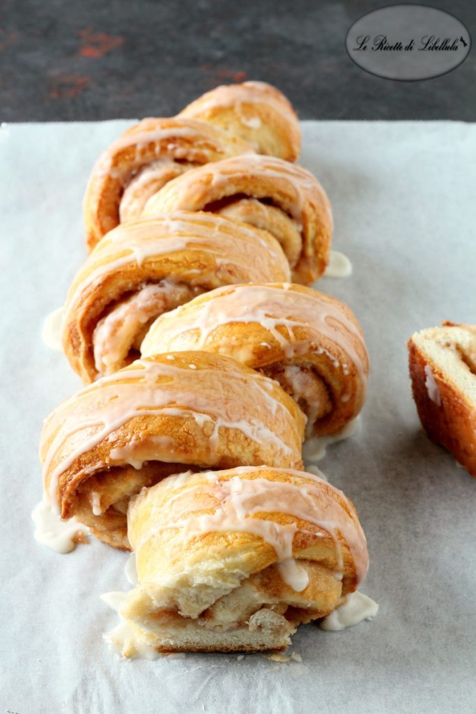 O pão doce com canela em rolo (cinnamon roll pull apart bread) é a união perfeita de dois doces muito populares nos Estados Unidos: os cinnamon rolls e o pull apart bread. A receita que proponho a seguir é para fazer em casa o pull apart bread: um pão doce que não precisa de faca porque as fatias já estão separadas entre si e é feito em forma retangular, para depois ser colocado em uma forma de bolo inglês. Neste caso, o pull apart bread é feito em um rolo e depois cortado em fatias, e após o cozimento é glaceado com açúcar, leite e baunilha: por isso lembra os famosos cinnamon rolls. Uma vez assado, este doce vai perfumar toda a cozinha com o aroma encantador de canela. Perfeito para o café da manhã e lanche, o pão doce com canela em rolo alegrará o seu dia!