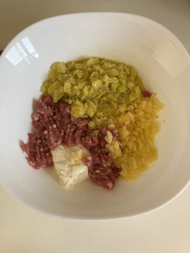 Enquanto isso, em uma tigela, amasse com um garfo as duas batatas cozidas e adicione a polpa da linguiça, o stracchino, depois o queijo ralado, a polpa das abobrinhas cozidas e, por fim, uma pitada de sal. Misture bem tudo e nosso recheio está pronto.