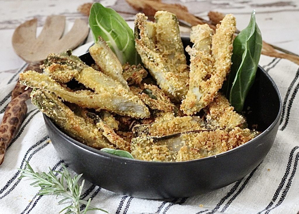 São empanadas primeiro no ovo e depois em uma mistura de farinha de rosca e queijo ralado, temperadas com azeite de oliva extra virgem e assadas no forno.