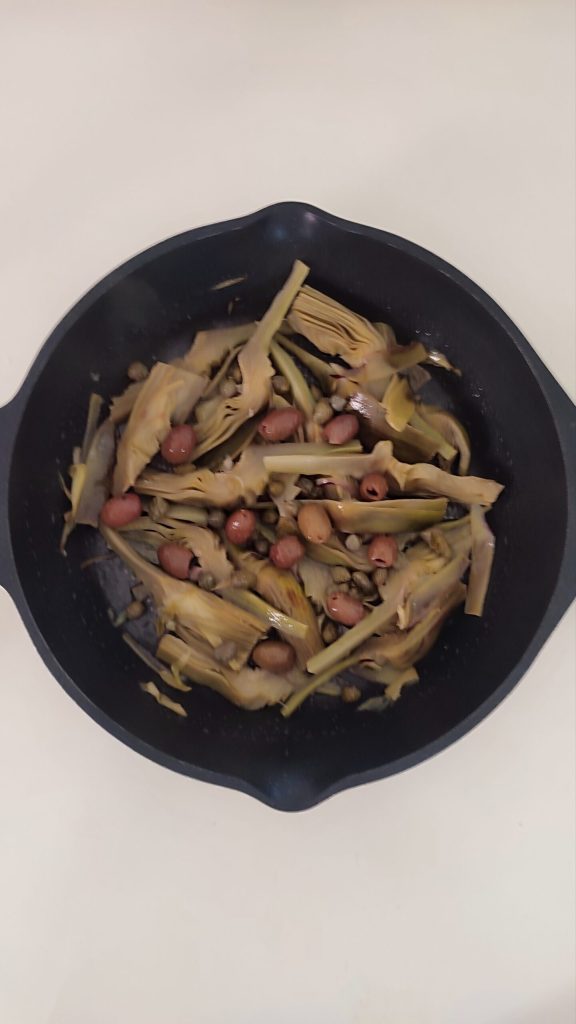 Escorra bem as alcachofras e adicione-as à frigideira. Refogue por 5 minutos em fogo médio, mexendo frequentemente, até começarem a dourar levemente e depois adicione uma concha de caldo de legumes, o sal, as azeitonas pretas e as alcaparras (se em sal, enxágue bem para eliminar o excesso de sal). Misture bem para amalgamar os sabores e cozinhe por mais 5-8 minutos com tampa em fogo médio baixo.