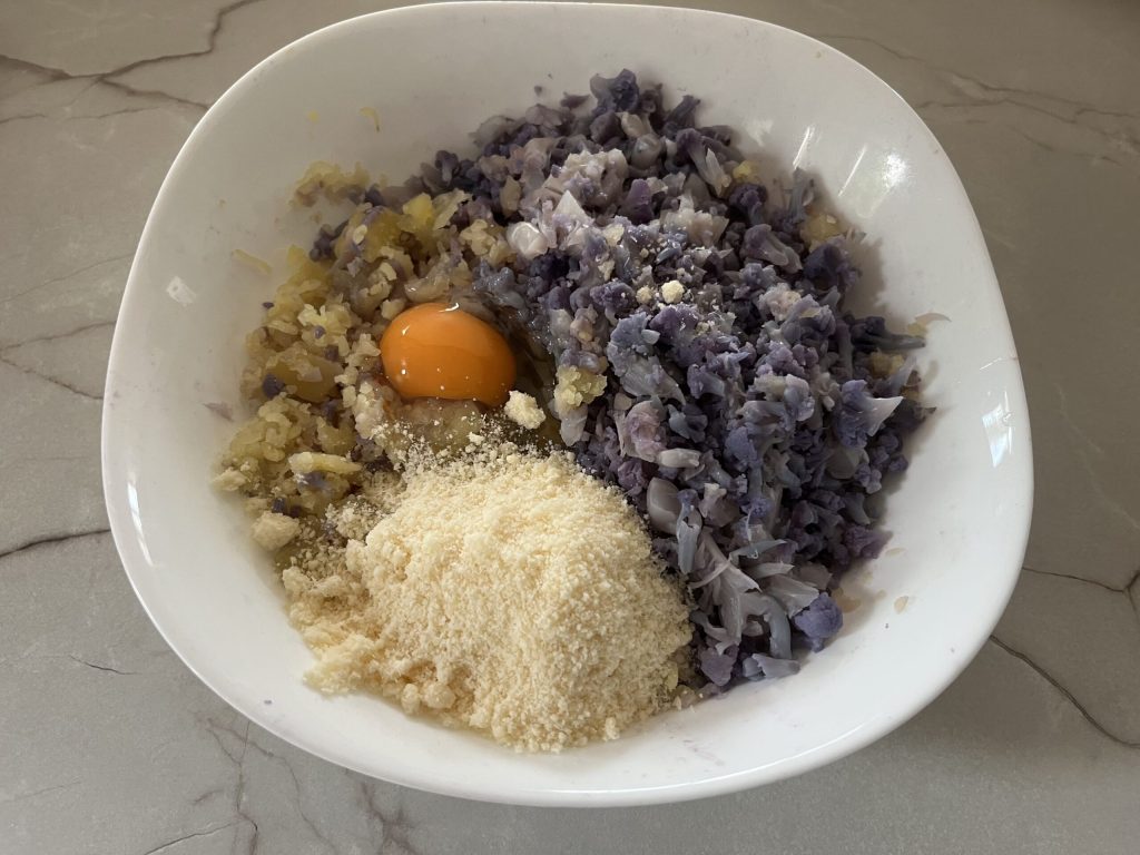 Ingredientes para os bolinhos de couve-flor roxa e batatas na fritadeira a ar