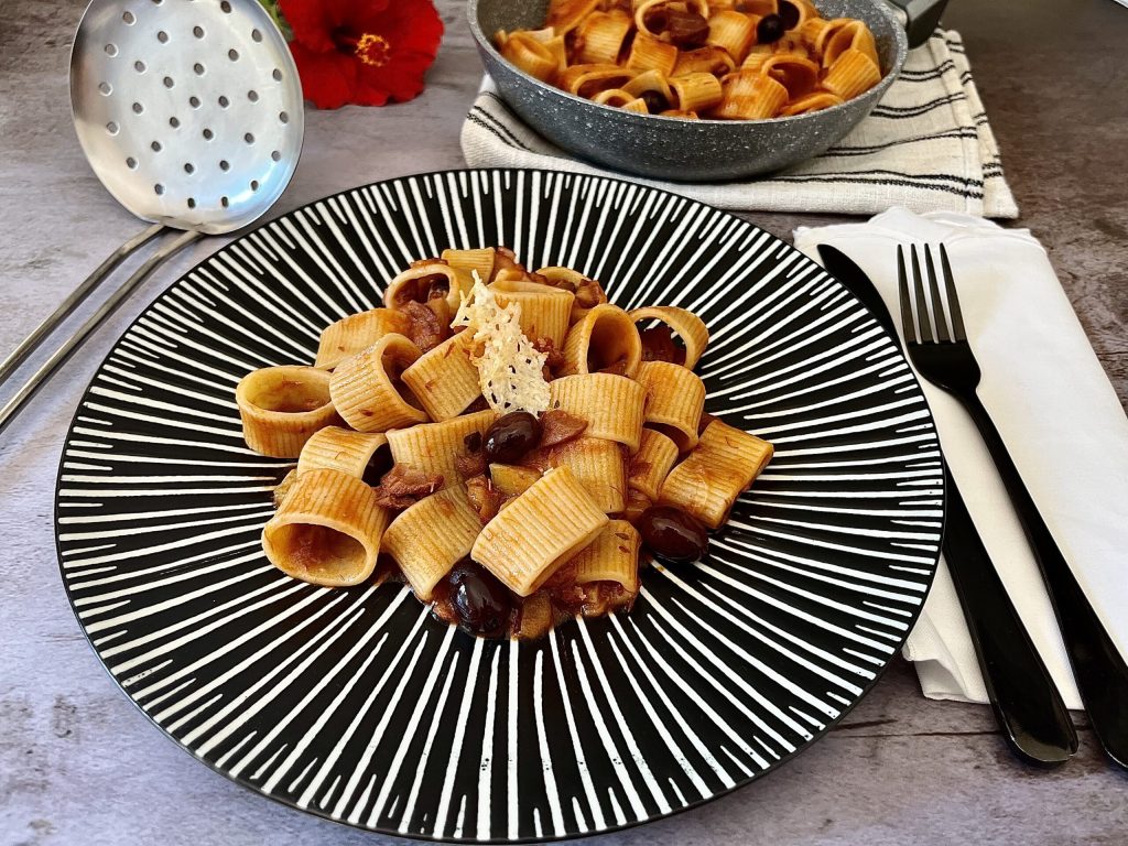 A calamarata risotada é um prato saboroso e rico. A particularidade desta receita é o modo de preparo, pois é cozinhada como um risoto. Assim, começa-se com um refogado de cebola e berinjela, depois adiciona-se a massa crua e tosta-se levemente, como o arroz, e depois é cozida adicionando caldo de peixe e o molho. Desta forma, a massa absorve todo o sabor do tempero e permanece cremosa. A escolha é fundamental, por isso optei pela calamarata da empresa Dispensa Della Casalinga, que mantém o cozimento. É uma massa artesanal, de trigo italiano de ótima qualidade.