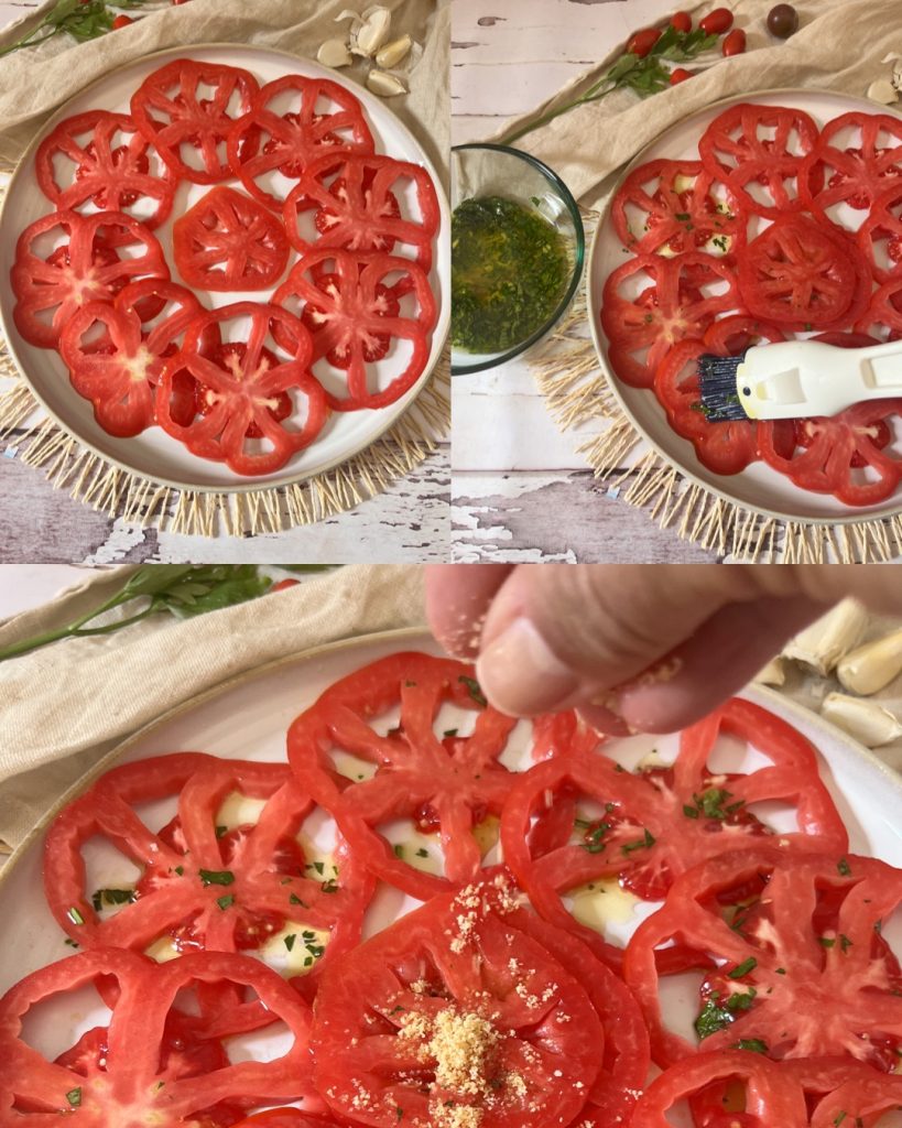 O prato é apresentado com fatias finíssimas de tomates frescos, dispostas elegantemente em um prato de servir. Os tomates, rigorosamente maduros e suculentos, são temperados com farinha de rosca tostada e uma emulsão de azeite de oliva, salsa fresca picada finamente e alho.