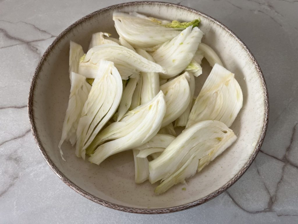 Fatie as ervas-doces ao meio com uma faca e depois em fatias de aproximadamente meio centímetro com uma mandolina
