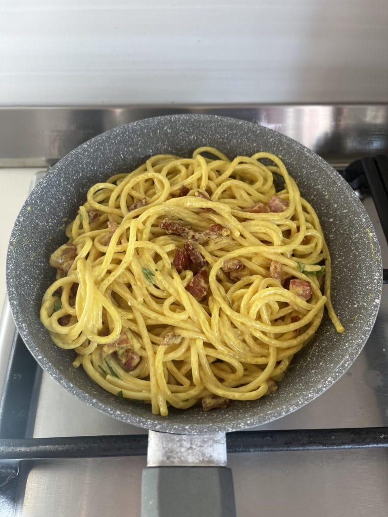• Os espaguetoni ao açafrão e guanciale estão prontos para serem servidos acompanhados de ótimos grissini… bom apetite!