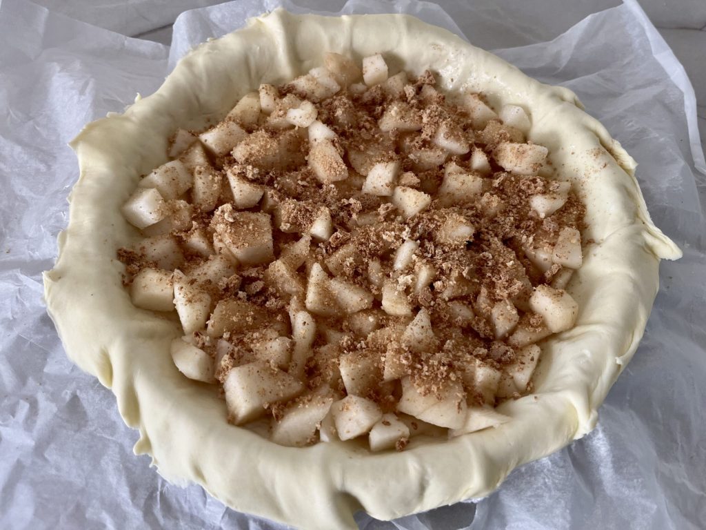 Coloque sobre uma forma redonda d.30 a massa folhada e coloque por cima as peras cortadas em pedaços.
