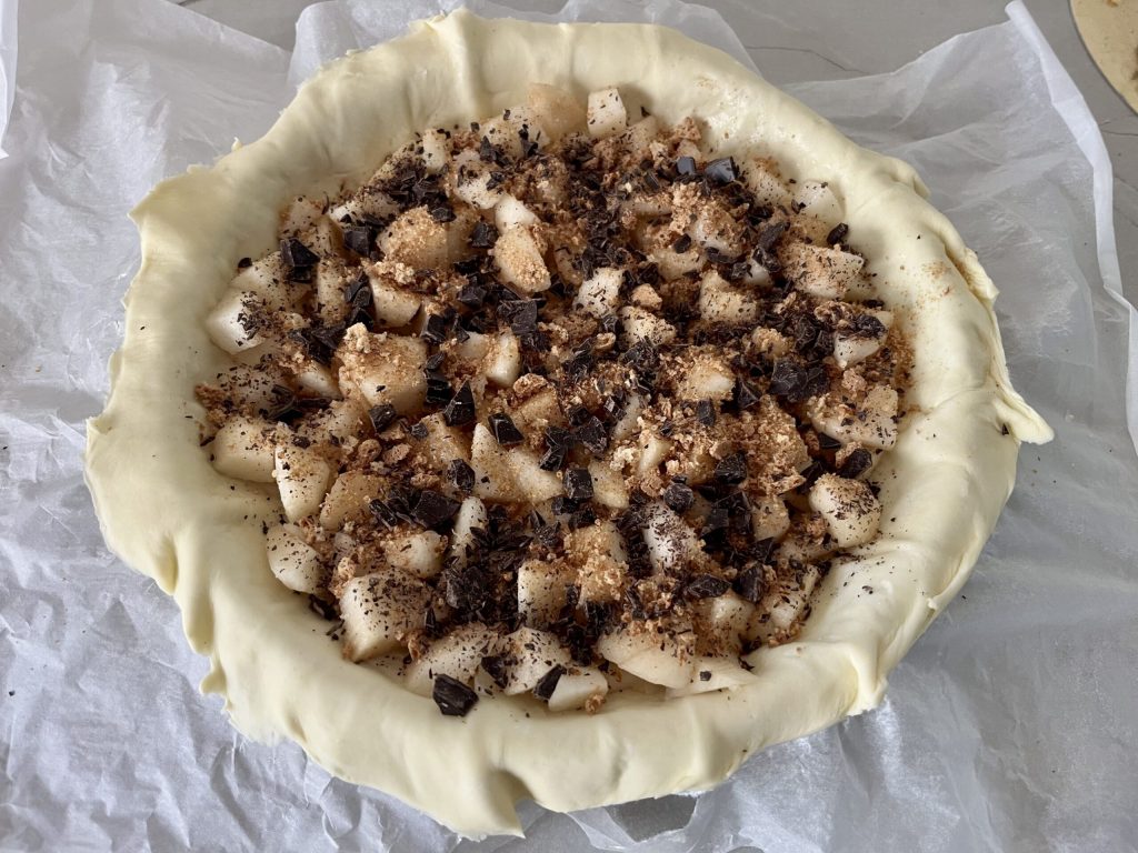 O folhado de pera e chocolate e amaretti é a versão simplificada do strudel de pera e chocolate.
