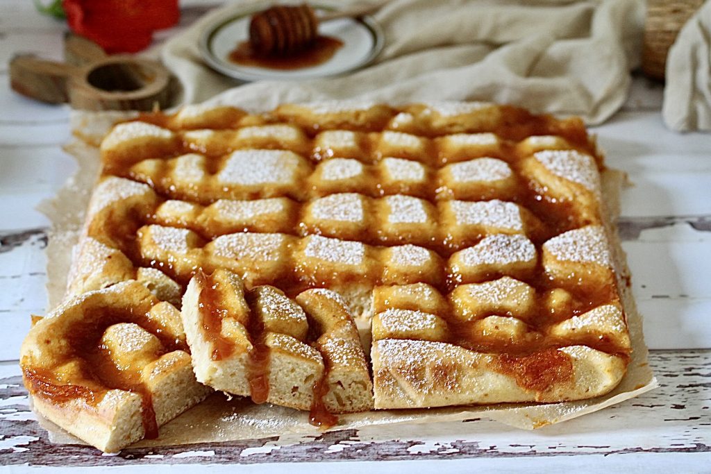 Preencha o saco de confeiteiro com a geleia extra de pêssego tabacchiera e faça linhas horizontais e verticais como no vídeo em toda a superfície, exceto as bordas. Desta forma, a geleia formará quadrados e penetrará no centro da massa.