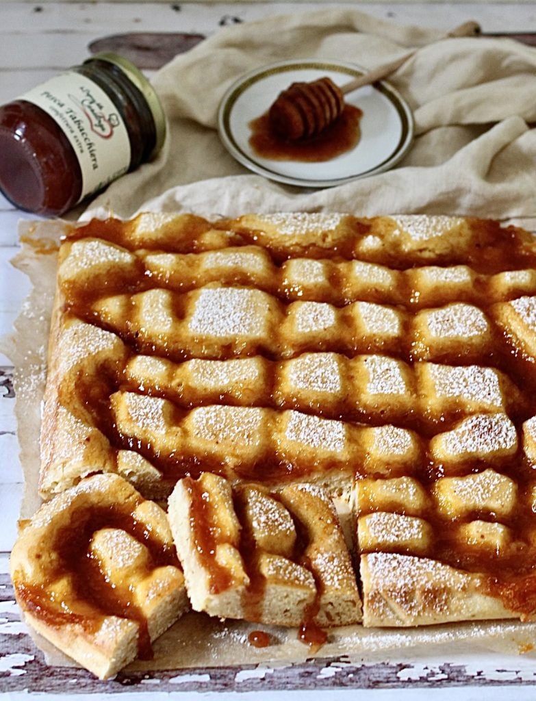 De preparo simples, genuína e saudável, pois é feita sem manteiga, com farinha especial menos refinada que retoma os métodos mais tradicionais de processamento, e com geleia de pêssego tabacchiera, obtida da seleção dos melhores pêssegos tabacchiera deliciosos e muito perfumados que têm o sabor do verão! Ambos os produtos vêm da minha empresa de confiança La Dispensa della Casalinga.