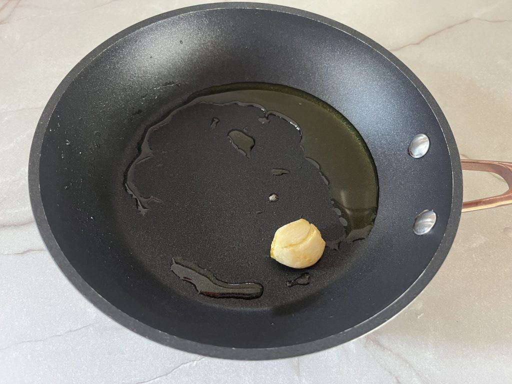 Em uma frigideira antiaderente refogue, com um pouco de óleo, um dente de alho. Uma vez dourado, remova-o.