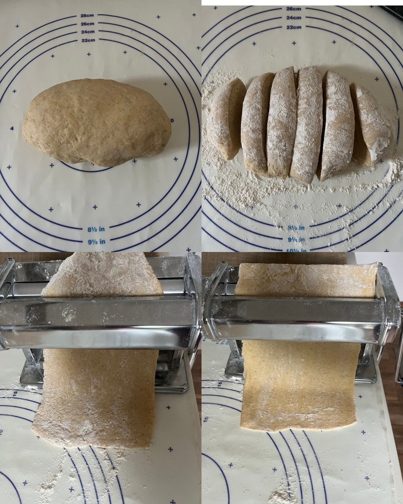 Passamos cada parte enfarinhada pela máquina de macarrão começando pelo nível mais grosso até chegar a um nível médio fino. A massa não deve ser muito fina, caso contrário, se romperá, mas também não muito grossa, digamos de uma espessura de cerca de 2mm.
