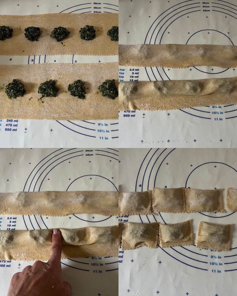 Finalmente, com um cortador de massa, cortamos os raviolis, eliminando o excesso de massa, que podemos amassar novamente e criar mais massa, e assim por diante. Enfarinhamos bem e cozinhamos em abundante água salgada, mexendo delicadamente uma ou duas vezes. Quando os raviolis começarem a ferver, cozinhamos por cerca de 5 a 6 minutos em fogo médio. Depois escorremos delicadamente com uma concha e temperamos a gosto e… bom apetite!
