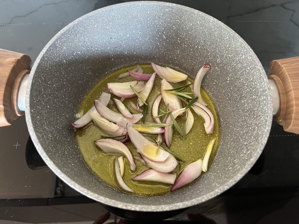 Despeje o azeite em uma panela e adicione a cebola e o raminho de alecrim. Refogue e remova o alecrim