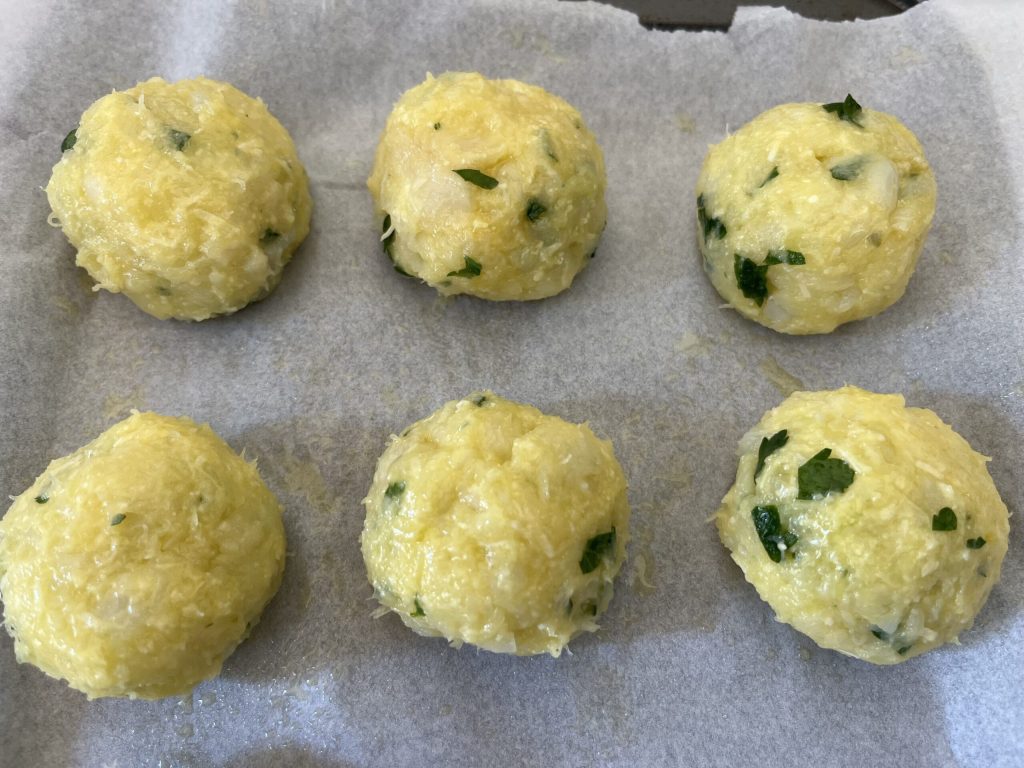 Pegue uma colherada generosa da massa e, com as mãos levemente úmidas, forme bolinhas do tamanho aproximado de uma noz