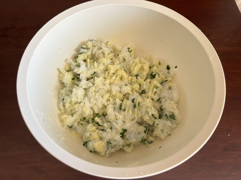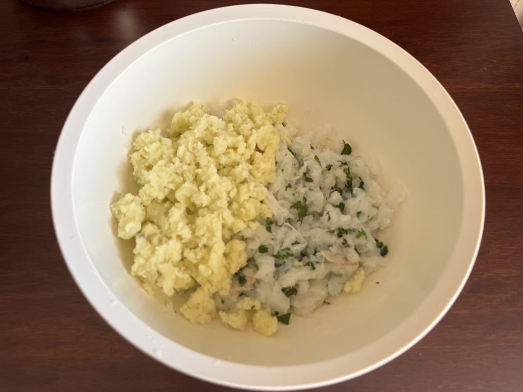 Terminado o cozimento, amasse as batatas com um garfo ou com um espremedor de batatas e desfie o bacalhau retirando eventuais espinhos. Pique a salsinha e junte tudo em uma tigela. Prove para ver se precisa adicionar um pouco de sal fino. Eu normalmente não acrescento, pois o bacalhau já vem salgado.