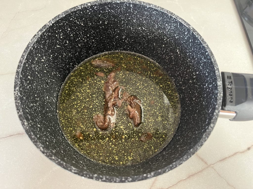 Uma vez que as anchovas derreterem, desligue o fogo e adicione o vinagre. Misture bem.