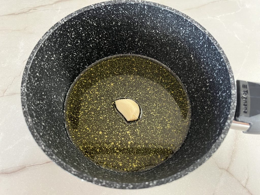 Em uma panela adicione o azeite e um dente de alho e refogue.