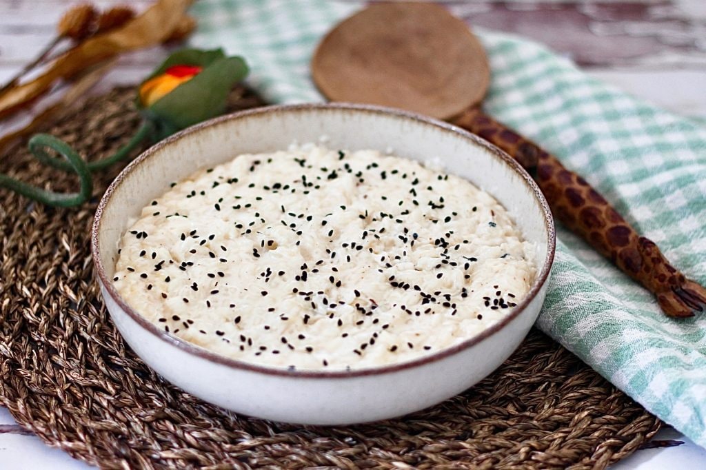 Pode ser servido como prato principal ou como acompanhamento de carnes ou peixes. Pode ser guarnecido com uma pitada de pimenta-do-reino moída na hora e salsa picada para um toque de frescor e cor ou, como eu fiz, com sementes de gergelim.