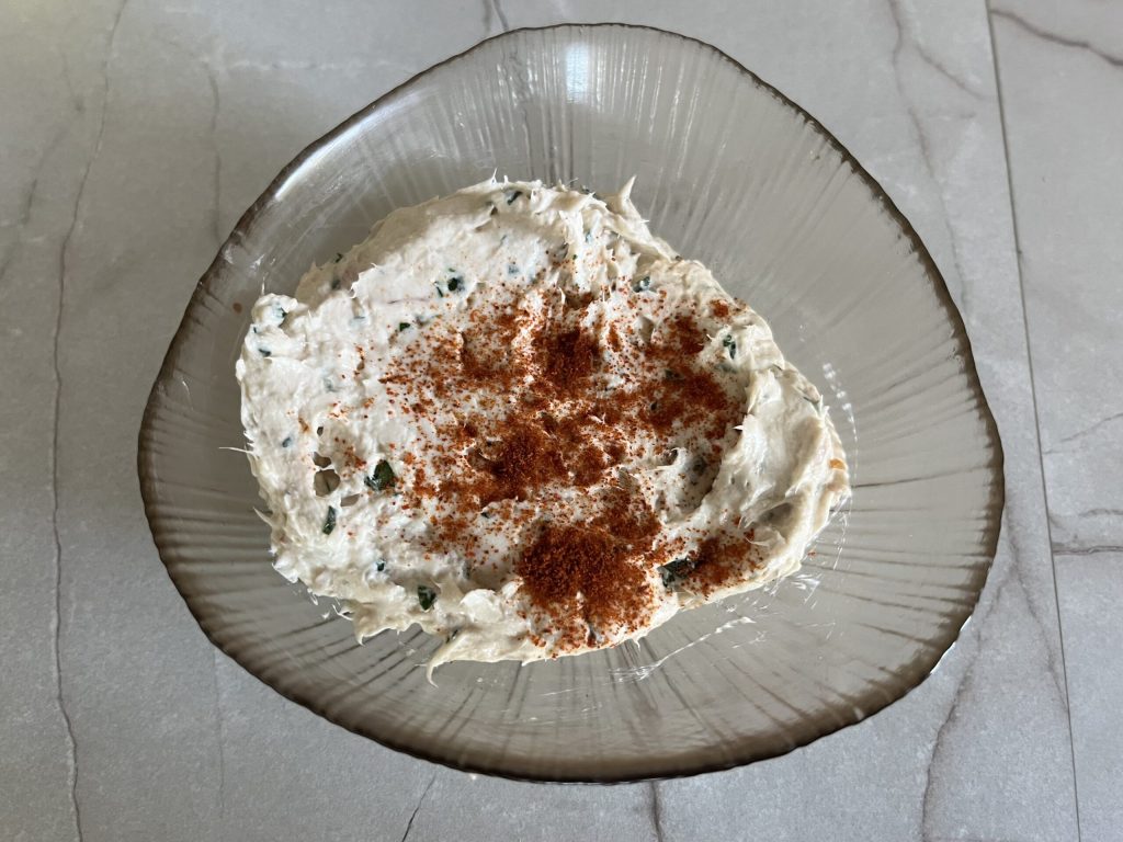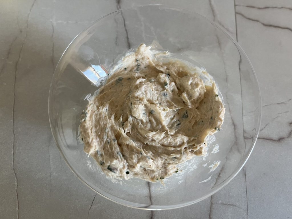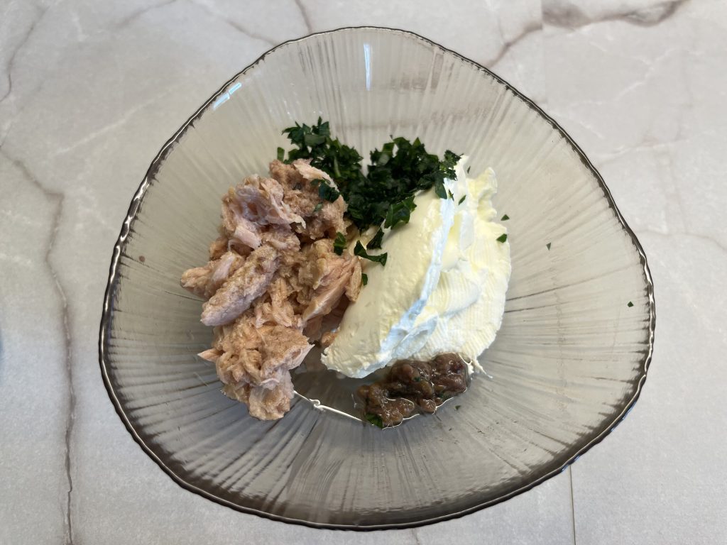 Em uma tigela, coloque o queijo cremoso, o atum escorrido, os filés de anchovas picados e a salsinha picada