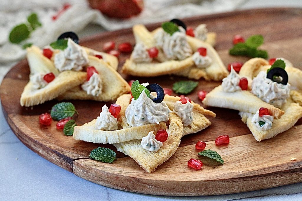Encha o saco de confeiteiro e recheie o centro dos rolinhos e os lados com o creme obtido, e decore com as azeitonas pretas sem caroço e cortadas em fatias finas, as sementes de romã e as folhas de hortelã fresca. Coloque em um prato de servir e sirva. Bom apetite da Barabara!