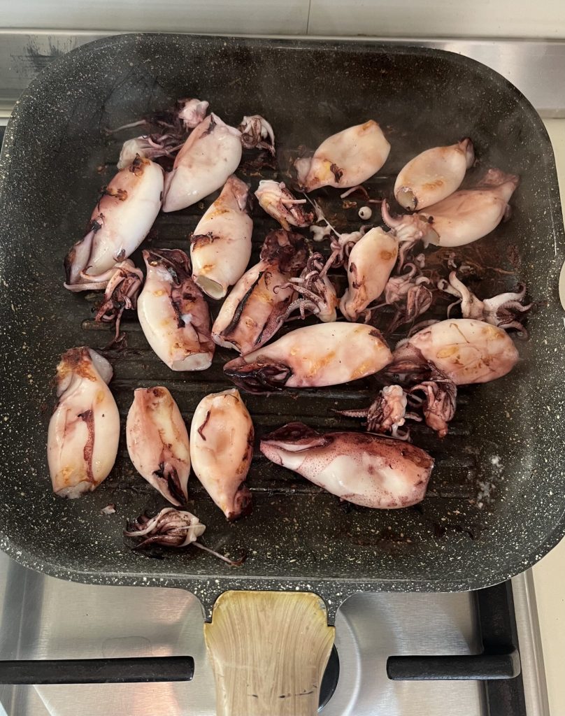 Em seguida, aquecemos muito bem uma grelha e cozinhamos as lulas, virando-as pelo menos duas vezes de cada lado por cerca de dez minutos.