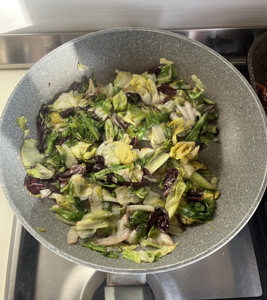 Enquanto isso, em uma frigideira antiaderente adicionamos meio dedo de azeite extravirgem e quatro dentes de alho esmagados com a lâmina de uma faca, de modo que a casca se separe da polpa e deixamos dourar. Uma vez dourados, removemos e adicionamos a salada, o sal e deixamos cozinhar por cerca de dez minutos, mexendo com uma espátula de madeira de vez em quando e com tampa.