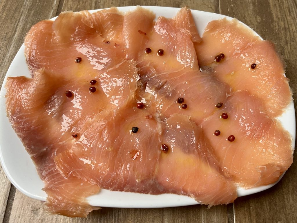 Escolha salmão defumado sem aromas artificiais de cor uniforme, rosa intenso, sem áreas opacas. Deve ter uma consistência compacta, não excessivamente úmida, uma lista de ingredientes curta: salmão, sal, fumaça natural. Poucas veias brancas e finas bem distribuídas são sinais de alimentação e crescimento corretos.
