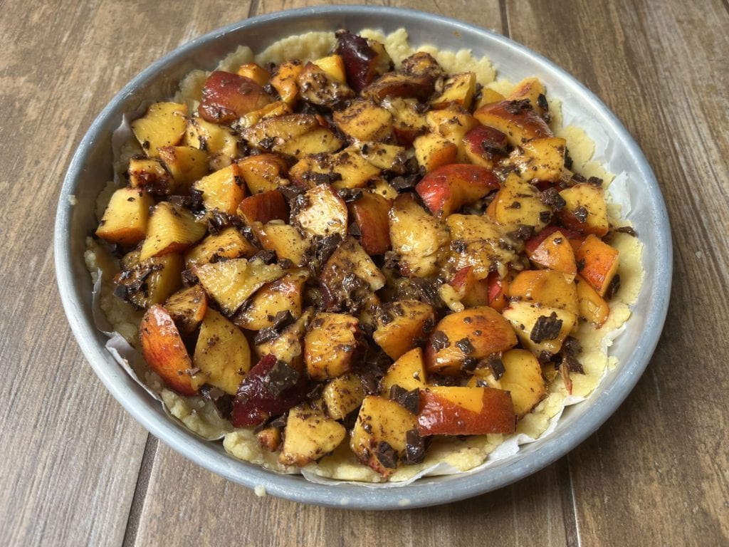 A sbriciolata de pêssegos e chocolate é uma sobremesa crocante e perfumadíssima, que lembra um pouco o crumble inglês, mas é mais semelhante a uma torta “desmontada”.
