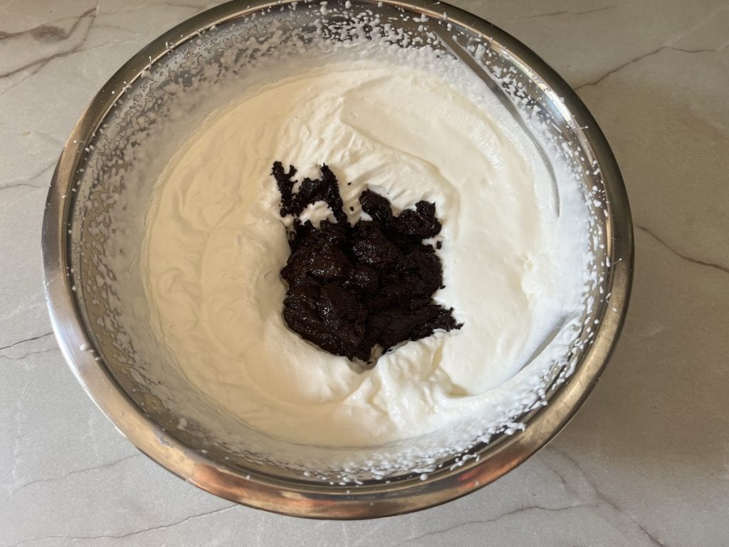 Adicione o chantilly ao composto de chocolate e gelatina em várias etapas, mexendo delicadamente de baixo para cima com uma espátula.