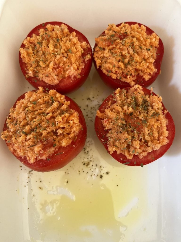 • Neste ponto, nosso recheio está pronto para rechear os tomates. Sejamos generosos com o recheio, deixando-o transbordar. Adicionamos uma pitada de orégano e os colocamos em uma assadeira previamente untada.