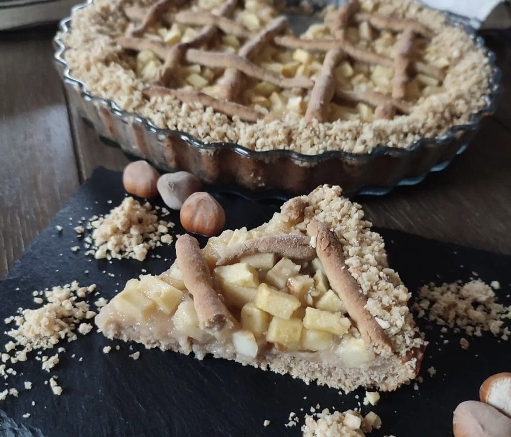 Cremosa e com um toque crocante, ela se diferencia das tradicionais tortas de maçã. Além disso, é feita com uma massa sem manteiga e açúcar mascavo, enriquecida com uma farofa de amendoim que faz a diferença.