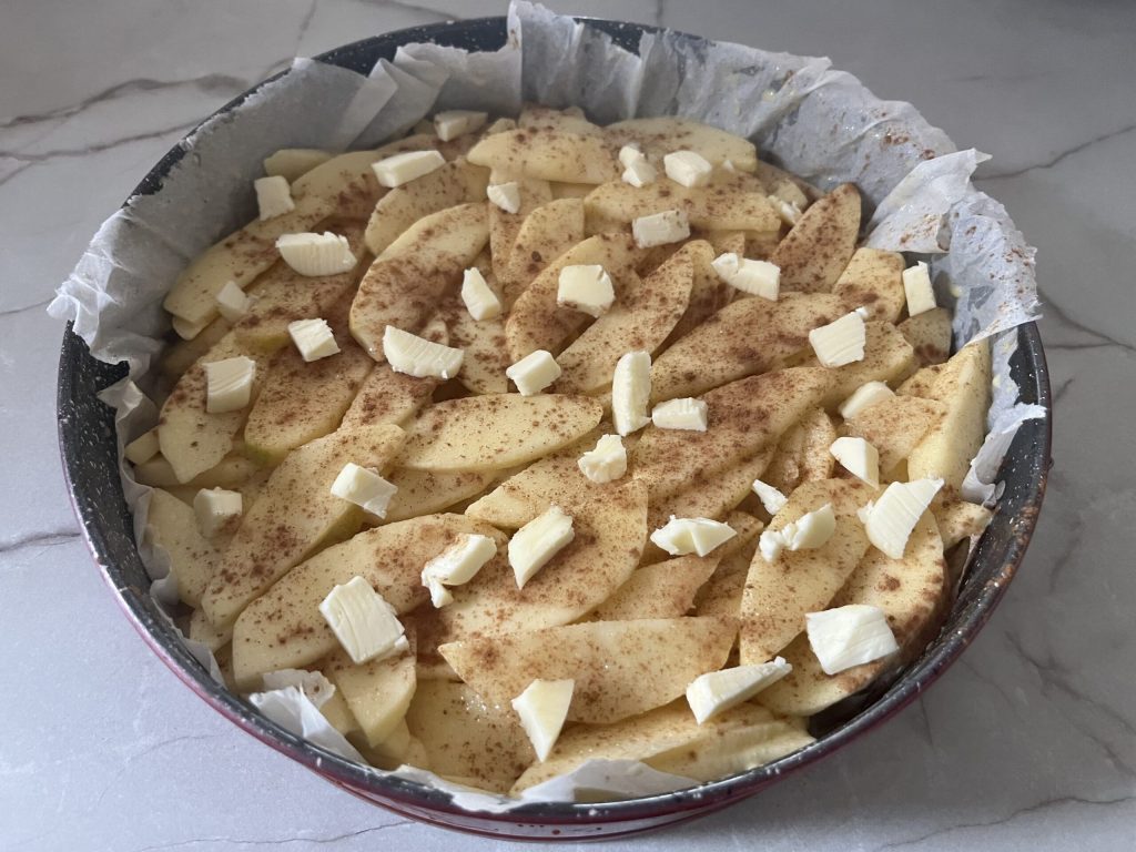 • Forre uma forma de 24 cm com papel manteiga e despeje a massa. Disponha as maçãs por cima e nivele uniformemente com uma espátula, compactando-as com a massa.