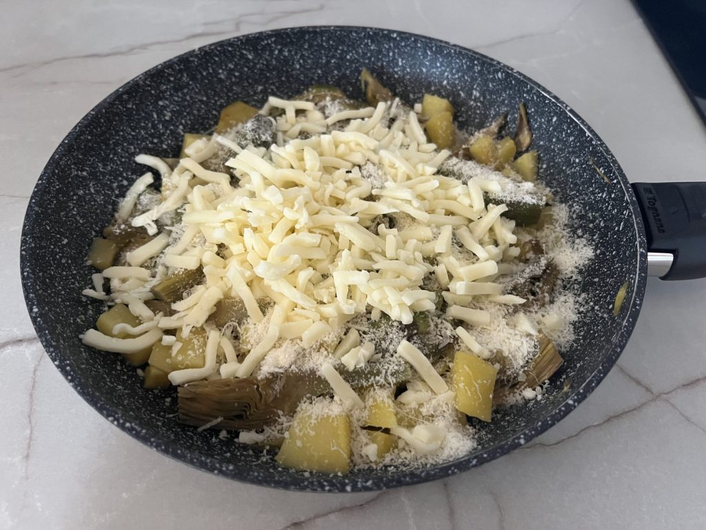 • Em uma frigideira grande aqueça um fio de azeite de oliva extra virgem e refogue as batatas em fogo médio, mexendo frequentemente. Após alguns minutos, cerca de 3-4, adicione as alcachofras bem lavadas e escorridas, ajuste o sal