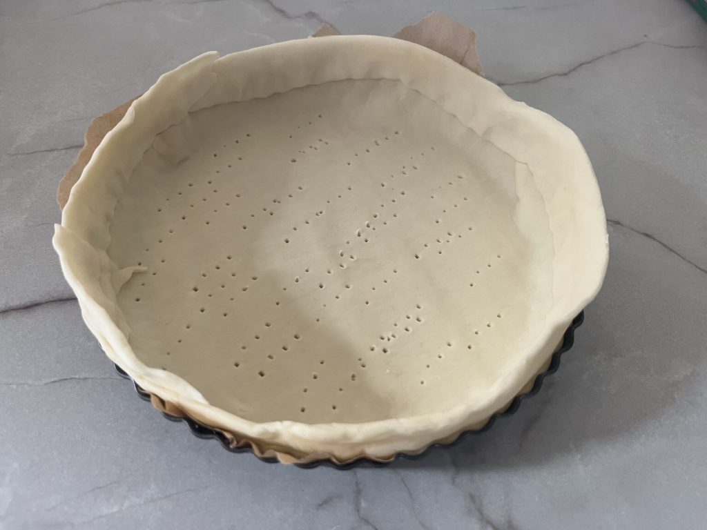 • Enquanto isso, prepare a massa brisée, para a receita clique AQUI ou, se não tiver tempo, pode comprá-la pronta. Estenda-a em uma forma redonda para airfryer d. 20 revestida com papel manteiga, ou unte levemente e faça furos no fundo com os dentes de um garfo