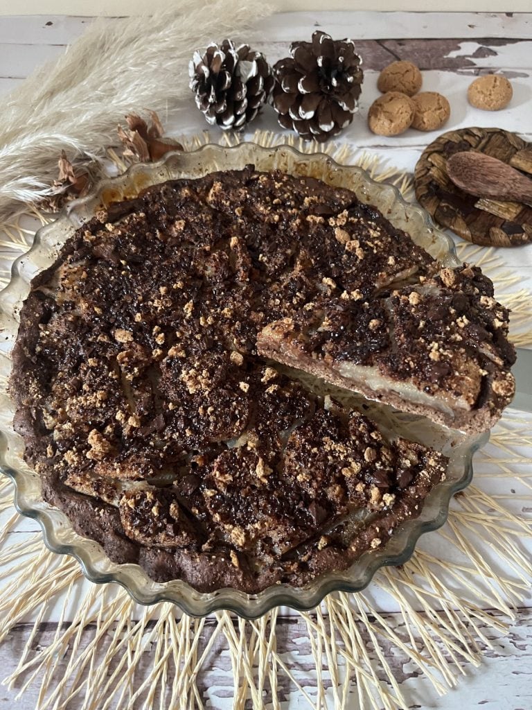 A torta de pera, chocolate e amaretti é uma sobremesa realmente deliciosa feita com massa folhada de café sem manteiga, coberta com várias fatias de pera, polvilhada com amaretti e chocolate amargo.