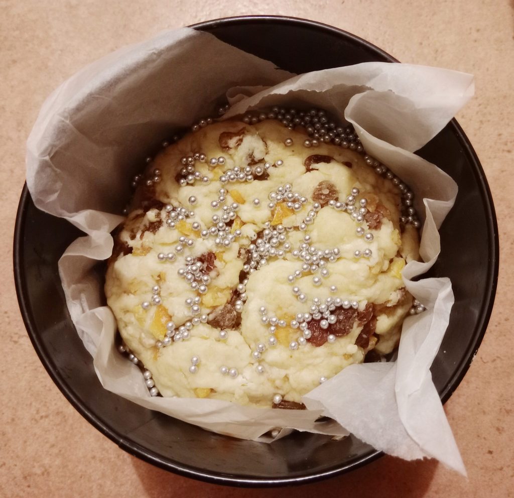 Coloque-a em uma forma para panetone forrada com papel manteiga, faça delicadamente um corte em X na superfície com uma faca e coloque os confeitos prateados.