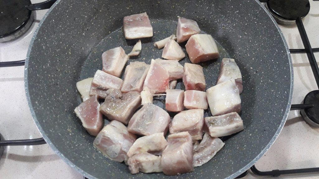 o peixe cortado em cubos, misture e cozinhe por 5 minutos antiorário 100º vel colher.