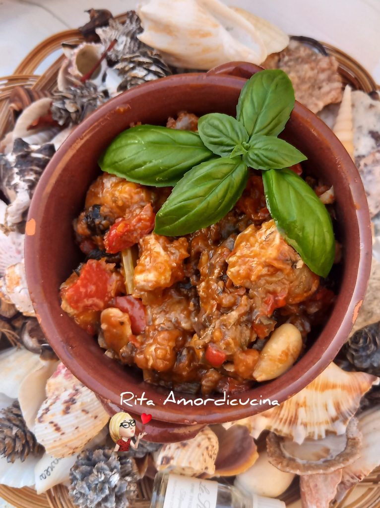 A caponata agora está pronta, e só precisamos adicioná-la ao peixe e cozinhá-los juntos por 2 ou 3 minutos, sempre mexendo.