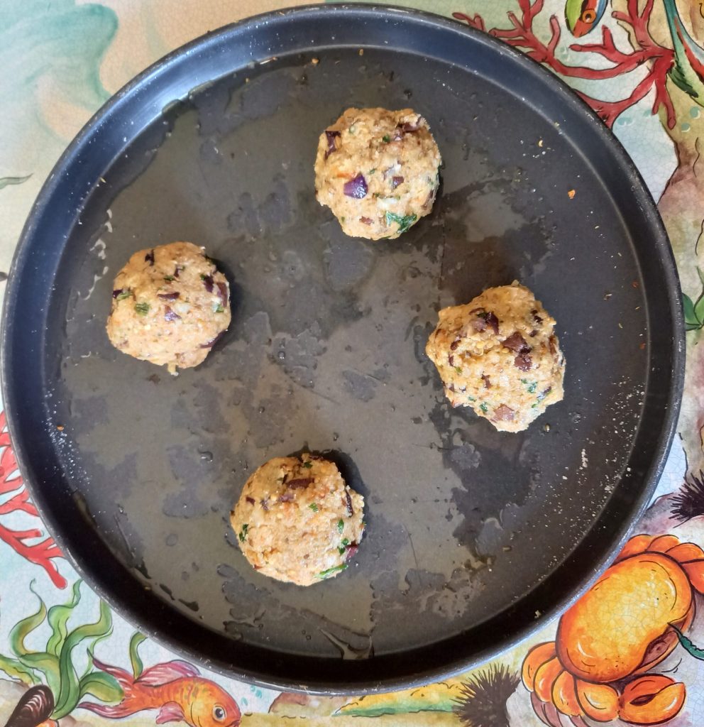 Forme 4 bolinhas, unte uma forma, com pouquíssimo azeite extravirgem, coloque as bolinhas,
