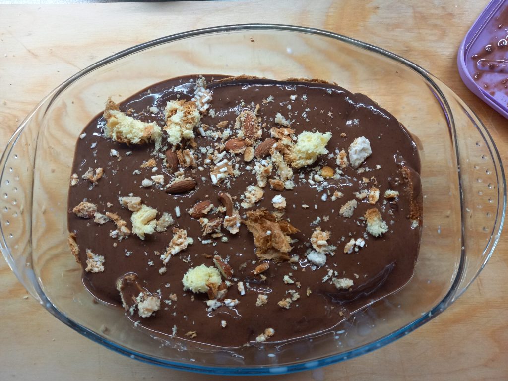 Eu usei uma colomba de 750 g, depois meio litro de creme de confeiteiro de chocolate e a mesma quantidade de creme de confeiteiro tradicional.